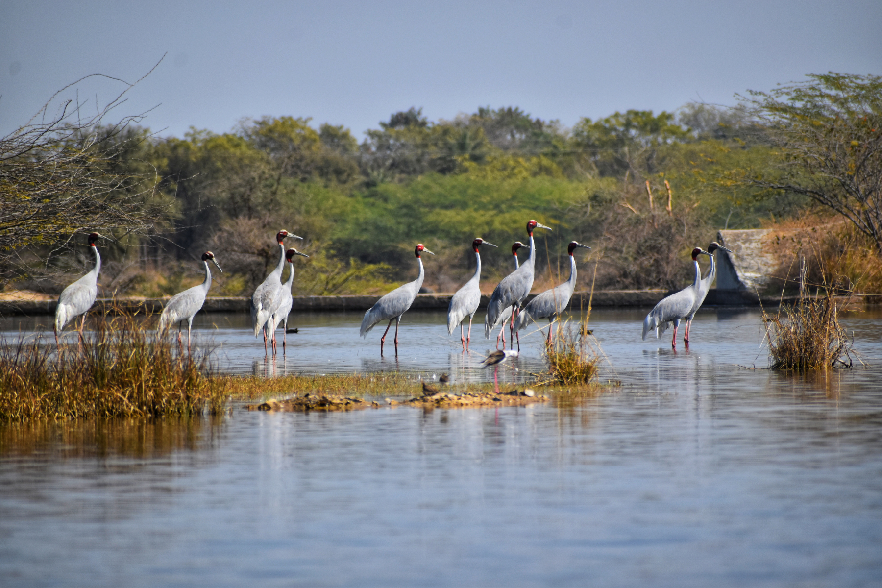 A flock of Sarus Cranes Grus antigone in the Menar wetland, which supports a healthy array of aquatic plants that provide food and shelter to migrant and resident avians. Photo: Umesh Menaria.