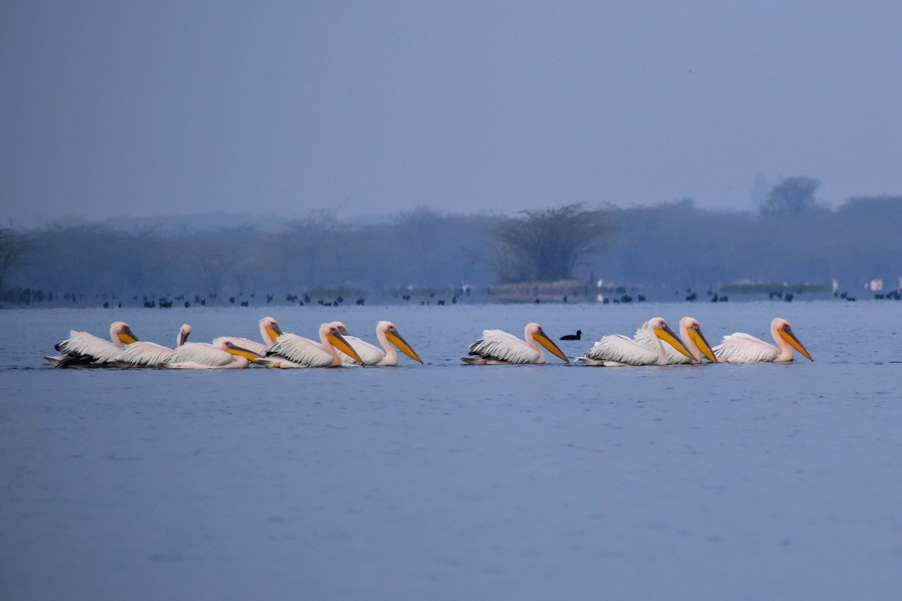 In December and January, between 8,000 and 10,000 waterfowl can be found here. In a year, over 20,000 waterfowl visit this area, many using this wetland complex as a stopover site during their arduous migration. This is demonstrated by the sudden influx of birds for a few days, followed by a quick, sharp decline in their numbers. A detailed, long-term study is necessary to ascertain this observation. About 62 species of aquatic birds have been reported in the Menar’s wetlands. If terrestrial birds are included, the total is close to 100 species. Among them, Knob-billed or Comb Duck, Cotton Pygmygoose, Indian Spot-billed Duck, and Lesser Whistling-duck are residents. The Great Crested Grebe has been observed breeding in Menar. The White-naped Tit, designated Vulnerable by the IUCN, has been reported in the thickets of Acacia nilotica on the banks of the lake. The Eurasian Bittern has also been recorded in Menar. Greater Flamingos too brighten the wetland during their short visit, as do Common Cranes in winter.