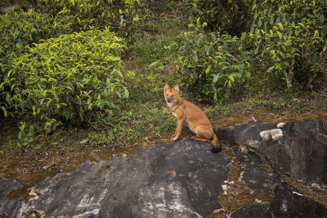 One early winter morning, one of our local informants spotted a pack in a nearby tea plantation. Adrenalised by the possibility of catching a glimpse of this ‘secretive’ canid, we rushed to a safe vantage point. I immediately began scanning the maze of tea bushes and the adjacent rocky outcrops. There it was! My eyes finally caught some movement amid the bushes; the wild red dog was trotting downhill towards the open rocky area. To my surprise, instead of a fierce pack on the hunt, a trail of frolicking pups emerged from the tea bushes!