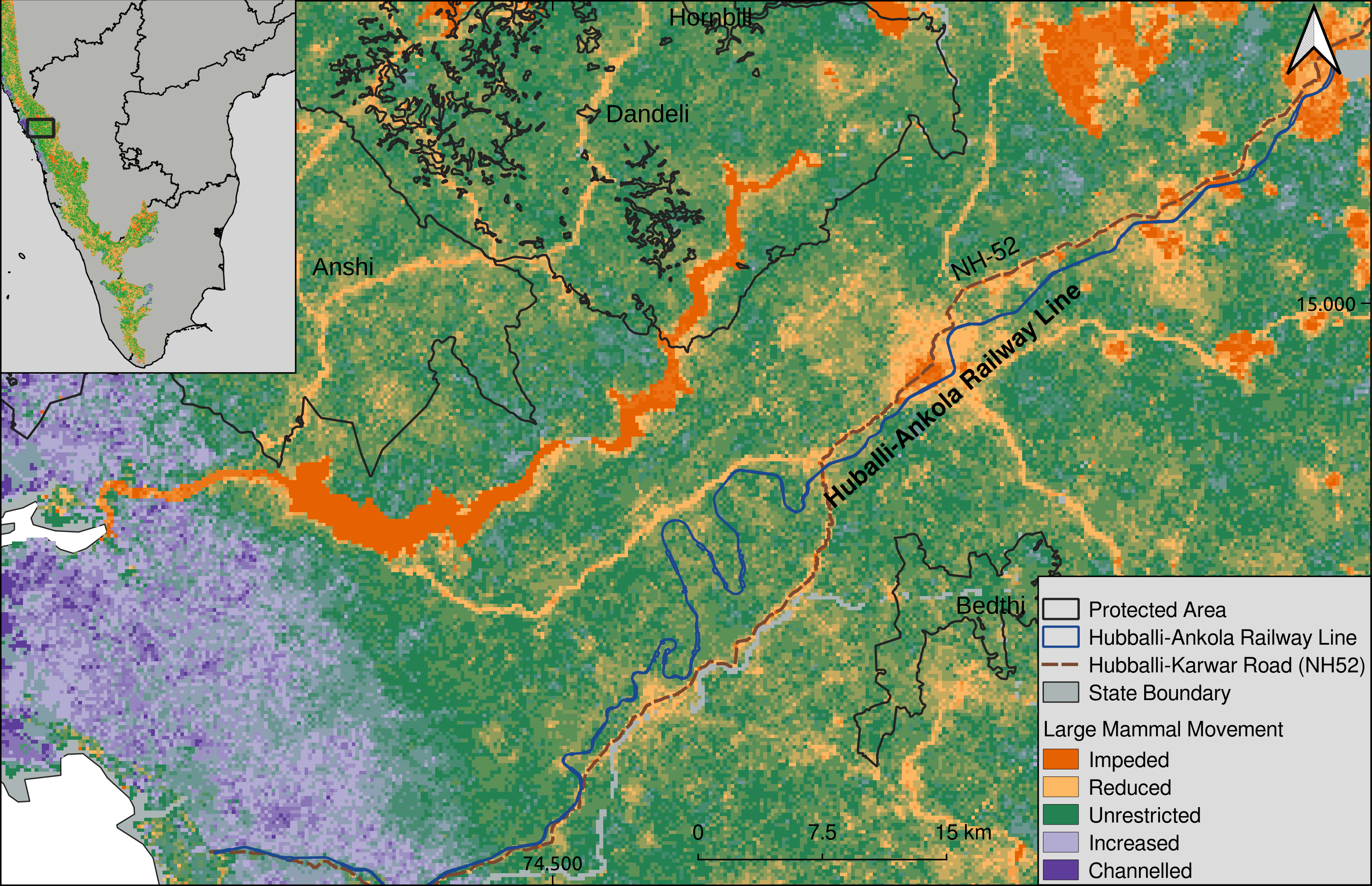 The earlier mentioned Huballi-Ankola railway line, which is under an interim stay order, will cut through 10 large forest patches in the Western Ghats if cleared. It will split these into 15 smaller patches, some of which may be too small to sustain the existing biodiversity in the long run. The proposed railway line will also pass through areas where movement of elephants, gaurs, leopards, sloth bears and sambar have already been reduced, and will only further increase fragmentation and hinder movement. The proposed railway line runs alongside the Huballi-Karwar road (NH52) and will thus pose an additional hindrance to animal movement, according to Rajat Nayak and Anisha Jayadevan, the lead authors of both papers.