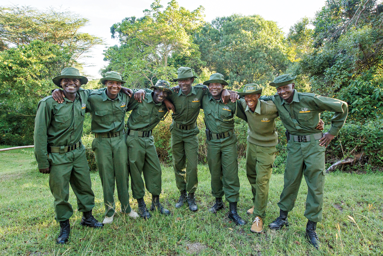 The smiling faces of the Enonkishu Conservancy team who work with ecosystems on the edge of the Mara Serengeti Ecosystem, a vast grassland and savanna landscape. The climate implications of rebuilding wildlife populations hold potential at a global scale. Grasslands alone store roughly 34 per cent of all terrestrial carbon on Earth. Photo: Enonkishu Conservancy.
