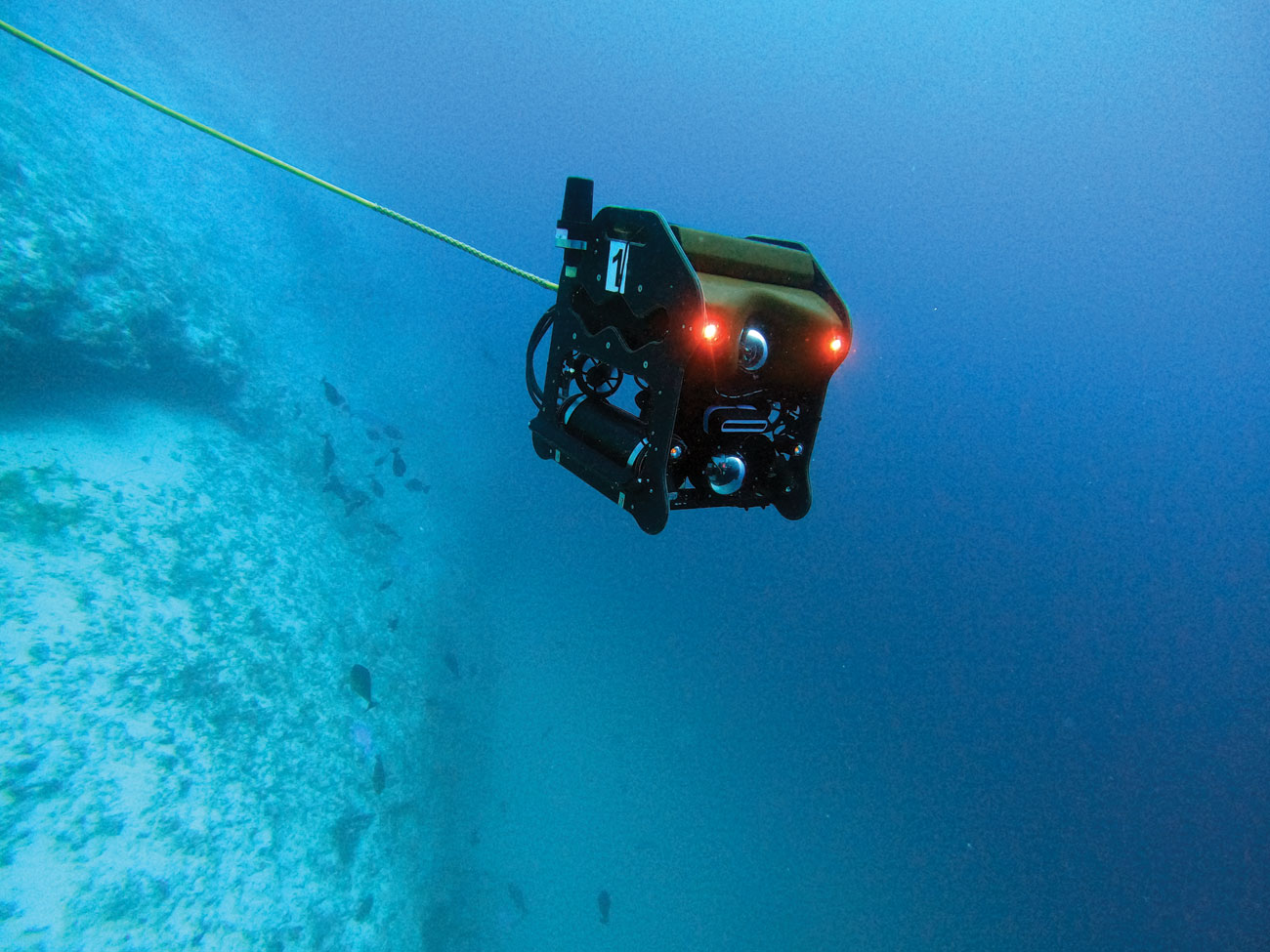 An unmanned remotely operated vehicle (ROV) tested as a means to explore and survey reef habitats lying beyond the depth limits of conventional scuba-assisted methods. Photo Courtesy: The Habitats Trust.