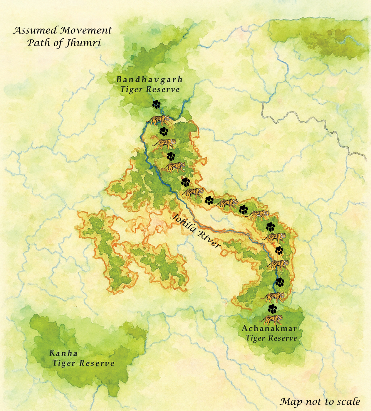 Illustration of the assumed path that Jhumri took to reach the Achanakmar Tiger Reserve. Photo Courtesy: WWF-India.