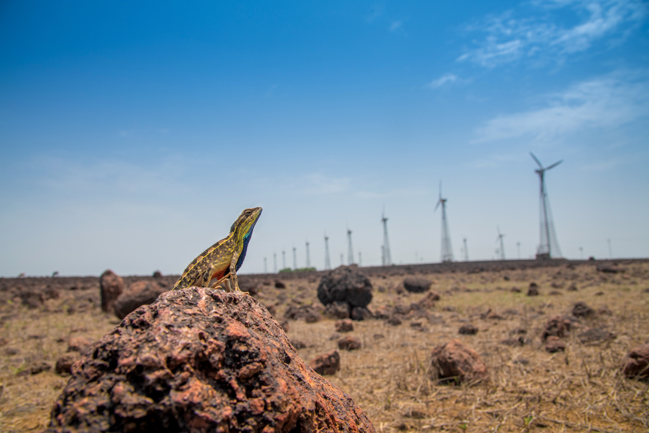 These lateritic plateaus teem with reptiles, including the fan-throated lizards of the genera Sitana and Sarada, whose males flaunt colourful throat fans during the breeding season. Yet the Wastelands Atlas of India (2010) labels them as 'barren rocky', which has paved the way for wind farms and other infrastructure. Photo: Anindita Datta Muhuri/Sanctuary Photolibrary.