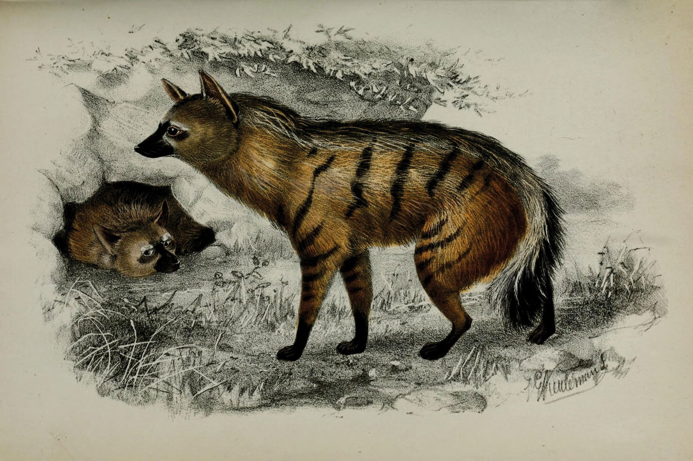 Aardwolf means ‘earth wolf’ in Afrikaans, which refers to the underground dens it lives in. It uses these burrows to raise young, avoid predators such as black-backed jackals, and take shelter during the daylight hours; it does not build these dens from scratch, but expands the burrows of springhares and porcupines. The aardwolf shifts homes every eight weeks, and can dig its own burrows when required. Since it is nocturnal, it encounters few animals and is a shy creature. However, when confronted with strangers, it raises its mane hair along its neck to appear aggressive; some hair strands can be as long as 15 cm.