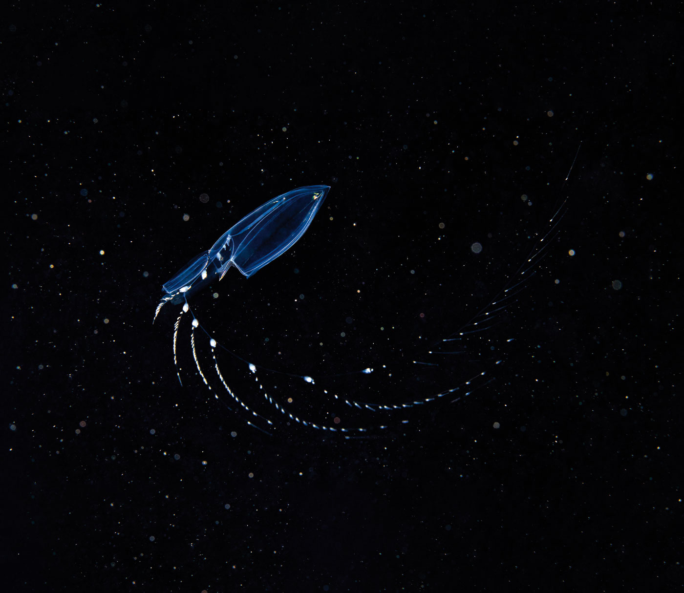 Deep inside the sea, where there is no natural light, only the glow emanating from strangely shaped beings, is one that can grow as long as 40 m. It is a giant siphonophore, which looks like a beautiful garland as its tentacles wave with the currents and catch the languidly falling marine snow (detritus). Related to the jellyfish and similarly translucent, there are 200 known species of this invertebrate. A closer look reveals that what appears to be a single creature is actually a long, chain-like colony of multiple individuals known as zooids. These are the same species and are clones of each other – they have the exact same genetic makeup. Each zooid has a specialised function, and it cannot survive on its own. All the parts work together symbiotically to survive the depths of the dark ocean.