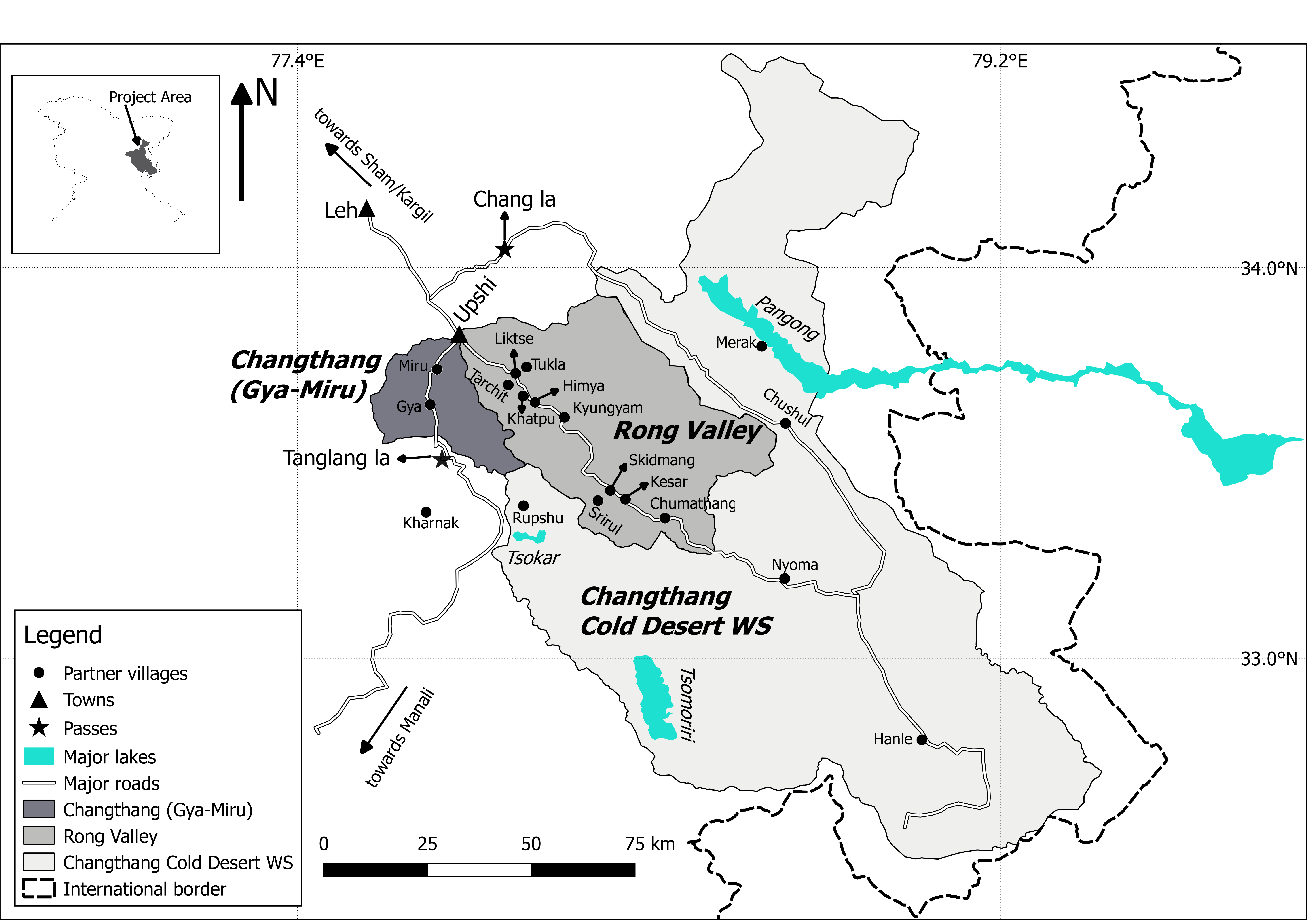 A map of the trans-Himalayan cold desert that is Ladakh, highlighting the Nature Conservation Foundation’s project survey areas to assess species density. Map Courtesy: NCF.