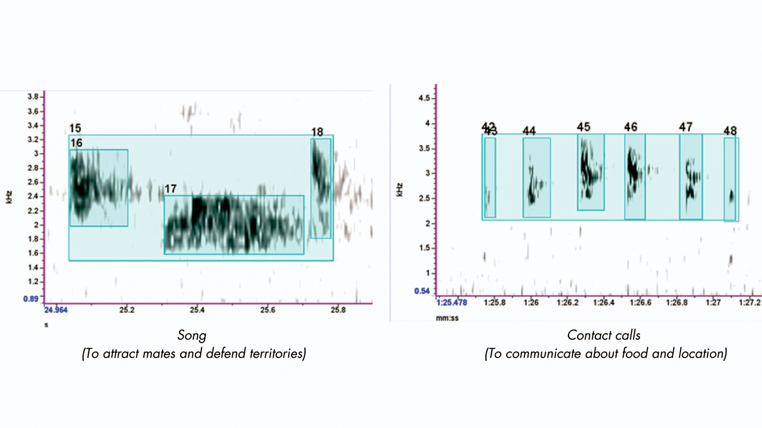 The spectrograms of Valparai’s rainforests, one of our other field sites, beam with the symphonies of endemics (found only in the Western Ghats) such as the White-bellied Blue Flycatcher and the Flame-throated Bulbul. While heavy downpours put a slow halt to the noisy cackles, pleasant mornings bustle with a medley of different species. Using acoustics, we recently found that birds vocalise more in the morning to advertise and defend their territories, and to communicate about food, especially insects.