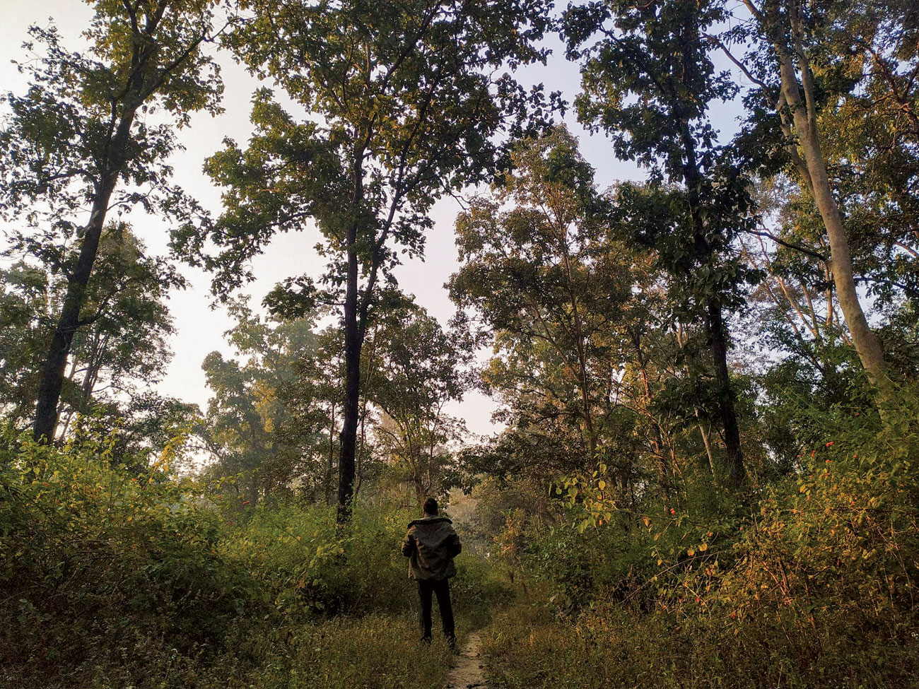 A researcher listens intently for bird sounds in Kanha’s buffer forest. Photo: Pooja Choksi.